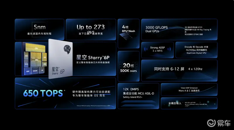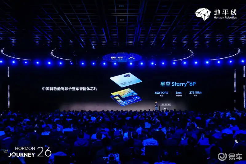 地平线星空系列基于全阶产品布局,推出星空Starry 6P、6H芯片。星空Starry 6P作为中国首款舱驾融合整车智能体芯片,它以5nm制程、650TOPS算力和273GB/s带宽,实现顶级智舱、智驾与端侧大模型性能的全面领先。更重要的是,它通过集成架构创新,实现了空间、器件与成本的三重优化。