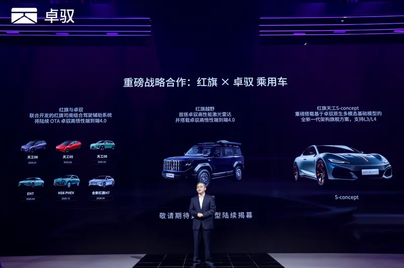 本次发布会上,卓驭宣布与中国一汽达成深度战略合作。乘用车领域,红旗与卓驭联合开发的红旗司南组合驾驶辅助已在红旗HS6、天工05、天工06等车型实现量产,高悟性端到端4.0模型将在今年上半年通过OTA升级上线,下半年上市的红旗越野将搭载卓驭高性能激光雷达。本次车展亮相的红旗天工S概念车采用基于卓驭原生多模态基础模型的全新一代架构,搭载L3/L4智驾解决方案。