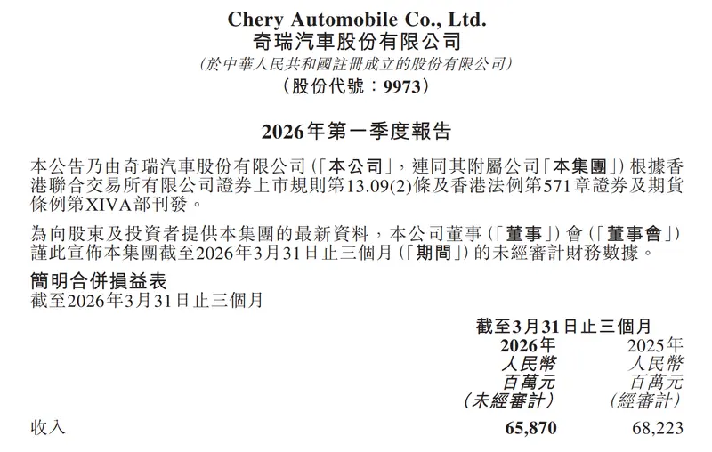 市场环境方面,2026年一季度中国汽车行业面临整体承压,国内汽车销量同比下降超20%,全行业利润率跌至2.9%的历史低位,新能源车渗透率从去年底的50%以上回落至42%。在此背景下,奇瑞通过全球化布局加速及毛利率改善,展现出较强的经营韧性。